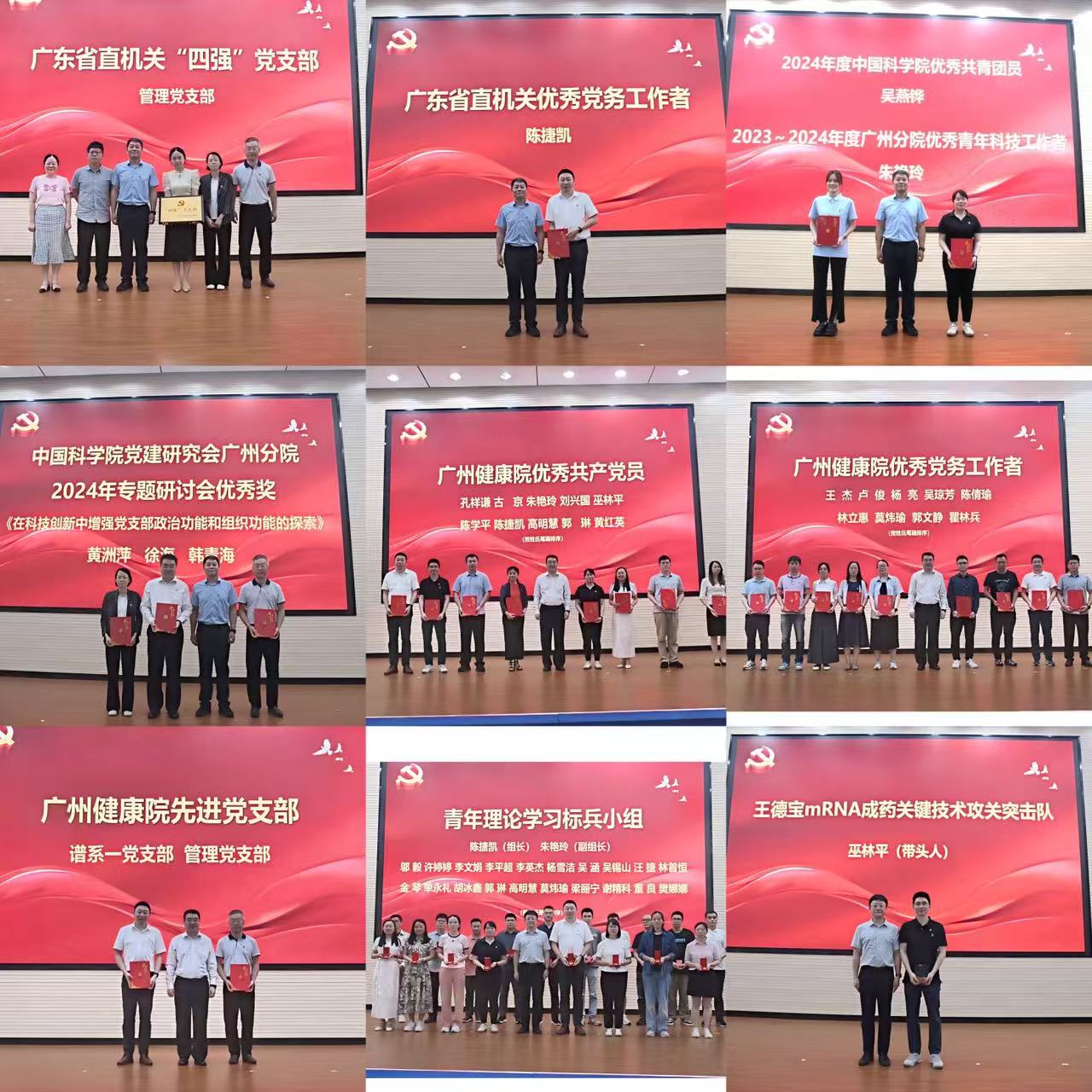 報告后,大會舉行新黨員入黨宣誓儀式,全體黨員重溫入黨誓詞。會議表彰了省直機關(guān)“四強”黨支部、優(yōu)秀黨務(wù)工作者、中國科學院優(yōu)秀共青團員和廣州分院優(yōu)秀青年科技工作者、廣州健康院“兩優(yōu)一先”等先進個人與集體,并為青年理論學習標兵小組授章。為激勵科研尖兵勇闖“無人區(qū)”,會上為新成立的王德寶mRNA成藥關(guān)鍵技術(shù)攻關(guān)突擊隊授牌。