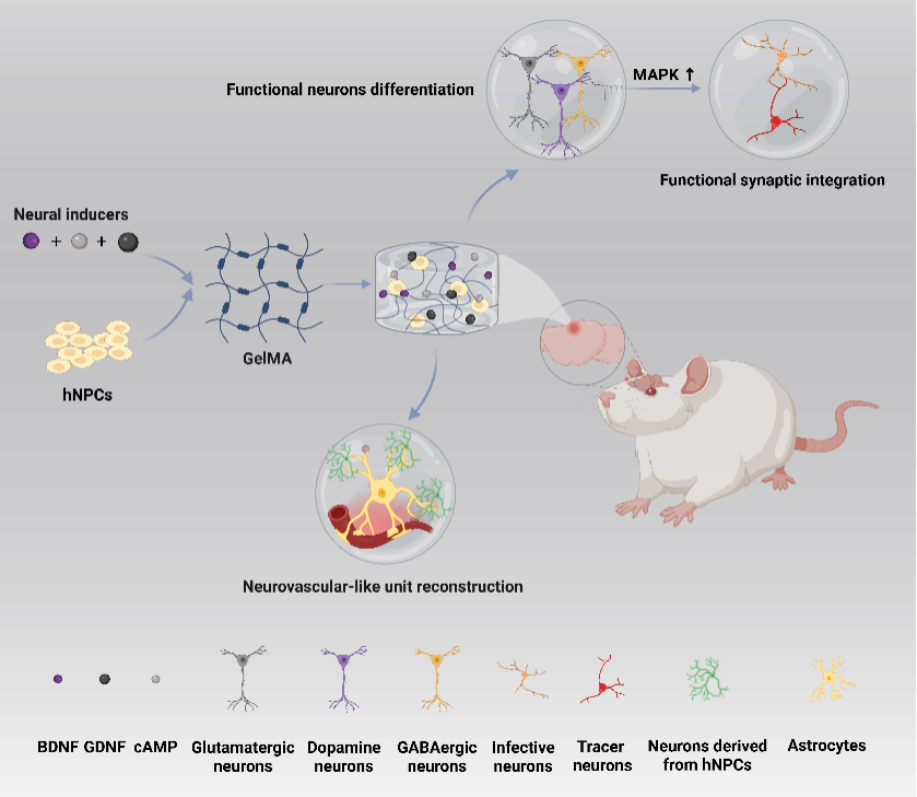 近日,中國科學(xué)院廣州生物醫(yī)藥與健康研究院巫林平研究員和潘光錦研究員團隊聯(lián)合在Journal of Advanced Research發(fā)表題為?"A cocktail hydrogel promoting the functional interneurons regeneration of human neural progenitor cells for brain injury therapy"?的研究論文。該研究從材料微納結(jié)構(gòu)調(diào)控與組織微環(huán)境模擬的雙重維度出發(fā),構(gòu)建了一種富含神經(jīng)調(diào)控因子的雞尾酒水凝膠,并闡明其在介導(dǎo)人源神經(jīng)前體細(xì)胞(hNPCs)向皮層中間神經(jīng)元分化及突觸連接形成過程中的作用機制,同時該水凝膠可以促進體內(nèi)神經(jīng)血管單元(neurovascular?unit, NVU)的重建,修復(fù)受損的腦組織。本研究為腦皮層損傷的細(xì)胞替代治療提供了重要的理論依據(jù)和新的治療策略。