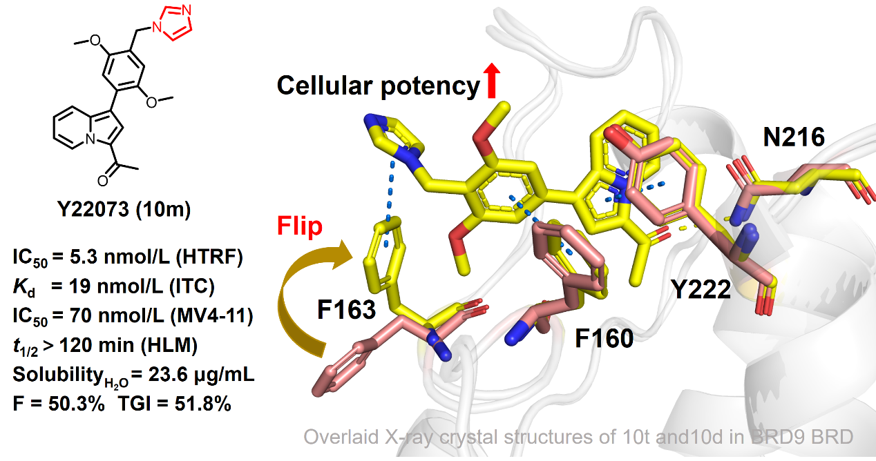 近日,中國科學院廣州生物醫(yī)藥與健康研究院許永團隊針對溴結(jié)構(gòu)域家族蛋白抑制劑選擇性難題,報道了一種在急性髓系白血病(AML)治療中具有顯著療效的BRD9選擇性抑制劑Y22073(專利申請?zhí)枺?025100176011.1),為AML 精準治療提供了全新解決方案。相關(guān)成果以“Key imidazolyl groups that induce phenylalanine flipping enhance the efficacy of oral BRD9 inhibitors for AML treatment”為題發(fā)表于藥物化學領域Top期刊Acta Pharmaceutica Sinica B上。
