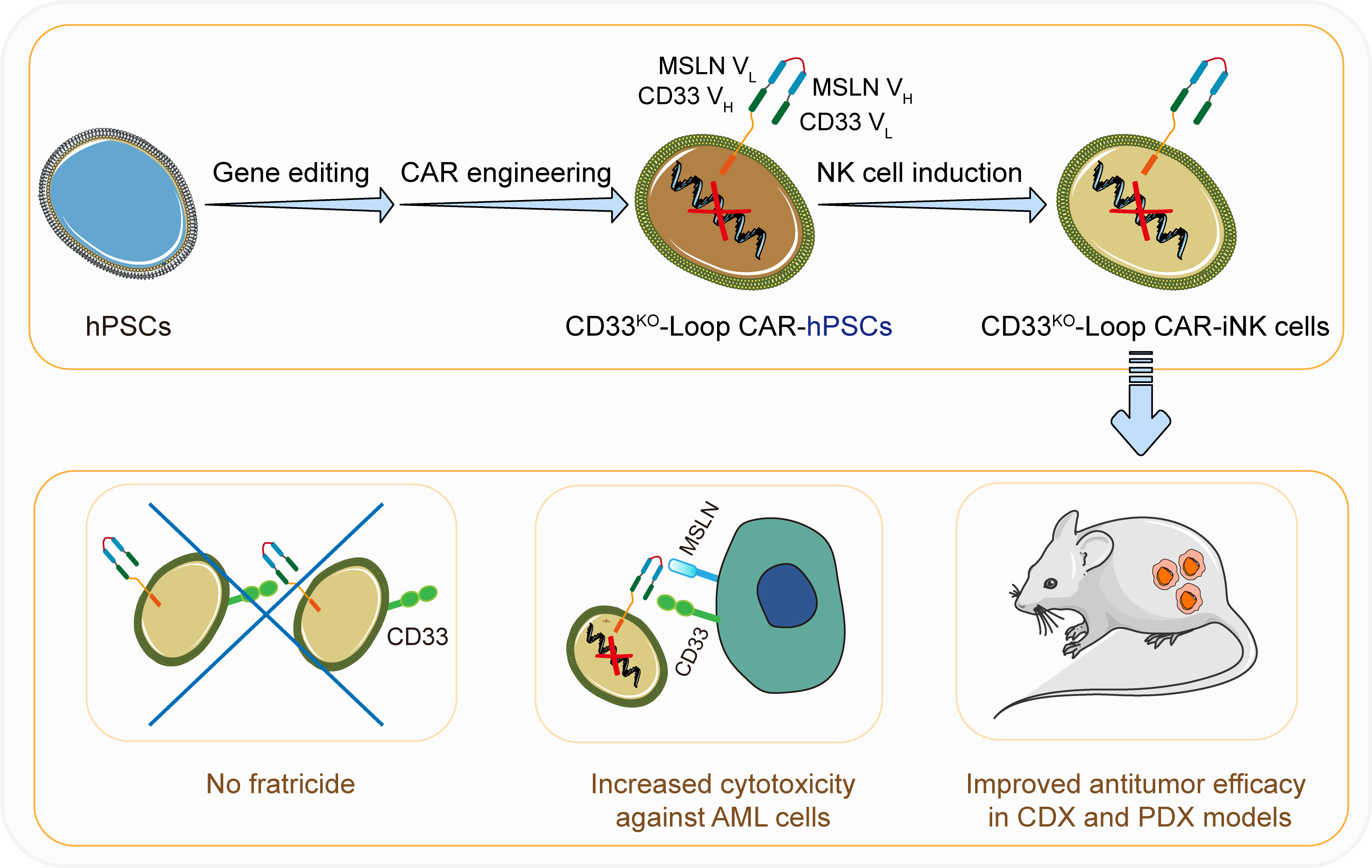 近日,中國科學(xué)院廣州生物醫(yī)藥與健康研究院(以下簡稱“廣州健康院”)血液譜系再生研究組在Journal for ImmunoTherapy of Cancer雜志在線發(fā)表了題為“CD33KO-CD33-mesothelin loop CAR design avoids fratricide and improves efficacy of iNK cells against acute myeloid leukemia”的研究論文。該研究針對間皮素(MSLN)和CD33靶點雙陽性的急性髓系白血?。ˋML)設(shè)計了環(huán)形雙靶點嵌合抗原受體(CD33-MSLN Loop CAR,Loop CAR),并基于臍帶血NK細(xì)胞(UCB-NK)或人多能干細(xì)胞(hPSCs)誘導(dǎo)的NK(iNK)細(xì)胞制備出Loop?CAR-NK或Loop?CAR-iNK細(xì)胞。Loop?CAR-NK細(xì)胞能夠有效殺傷AML細(xì)胞。研究還進(jìn)一步通過在hPSCs中敲除CD33基因解決了Loop?CAR-iNK細(xì)胞因靶向自身CD33抗原分子而引起的“自相殘殺”問題。該研究為AML細(xì)胞治療新策略提供理論和技術(shù)依據(jù)。