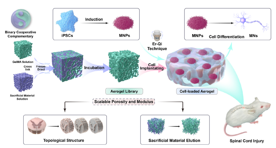 中國科學(xué)院廣州生物醫(yī)藥與健康研究院(以下簡稱“廣州健康院”)納米轉(zhuǎn)化醫(yī)學(xué)研究組和華中科技大學(xué)協(xié)和醫(yī)院孫家明教授團(tuán)隊近期聯(lián)合在 Materials Today Bio發(fā)表了題為 “Aerogel library with varying porous structures and mechanics regulates motor neuron progenitor differentiation for spinal cord injury repair” 的研究論文。該研究構(gòu)建了一種微納結(jié)構(gòu)與力學(xué)性能可調(diào)控的多孔氣凝膠庫,揭示了仿生三維微環(huán)境的孔隙結(jié)構(gòu)與力學(xué)強(qiáng)度對人源誘導(dǎo)多能干細(xì)胞(hiPSCs)來源的運動神經(jīng)前體細(xì)胞(MNPs)譜系命運調(diào)控作用和關(guān)鍵分子機(jī)制,并驗證了其在脊髓損傷修復(fù)中的功能再生潛力。