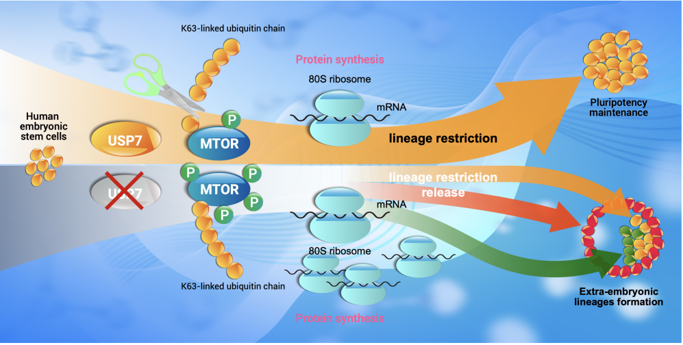 近期,中國(guó)科學(xué)院廣州生物醫(yī)藥與健康研究院發(fā)表了題為“USP7 restricts lineage potency in human embryonic stem cells through modulating mTOR activity”的研究論文。該研究揭示了一種限制人多能干細(xì)胞發(fā)育潛能的關(guān)鍵因子——去泛素化酶USP7,并闡釋其通過去除mTOR 蛋白上非經(jīng)典K63多泛素化修飾,從而調(diào)控 mTOR 活性的全新機(jī)制。