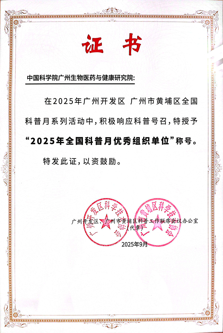 近日,中國科學(xué)院廣州生物醫(yī)藥與健康研究院(以下簡(jiǎn)稱 “廣州健康院”)憑借在全國首個(gè)科普月期間的出色組織能力、豐富活動(dòng)形式及顯著社會(huì)成效,獲得黃埔區(qū)授予的“2025年全國科普月優(yōu)秀組織單位”稱號(hào)。