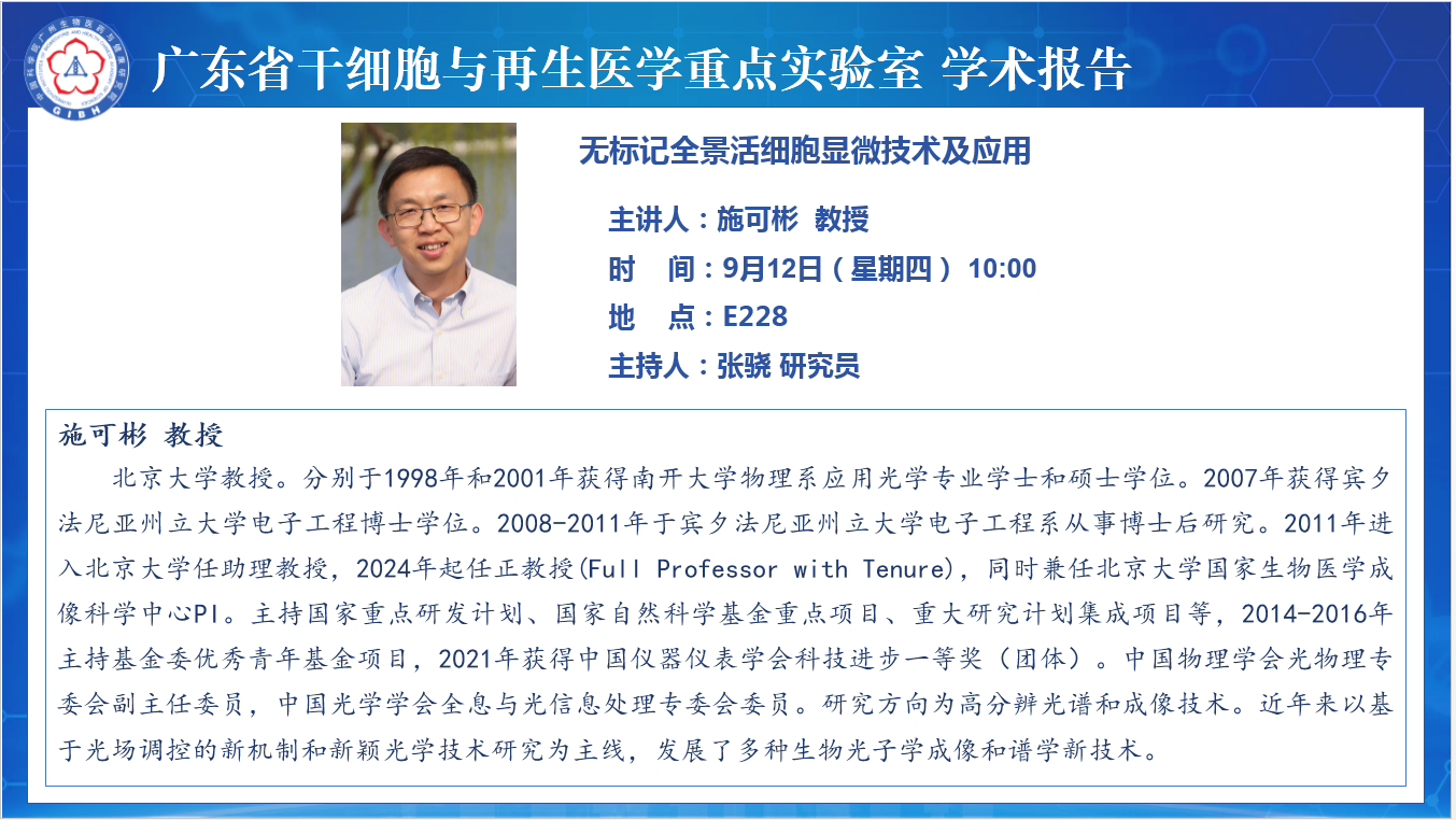 2024年9月12日廣東省干細胞與再生醫(yī)學重點實驗室學術報告:無標記全景活細胞顯微技術及應用