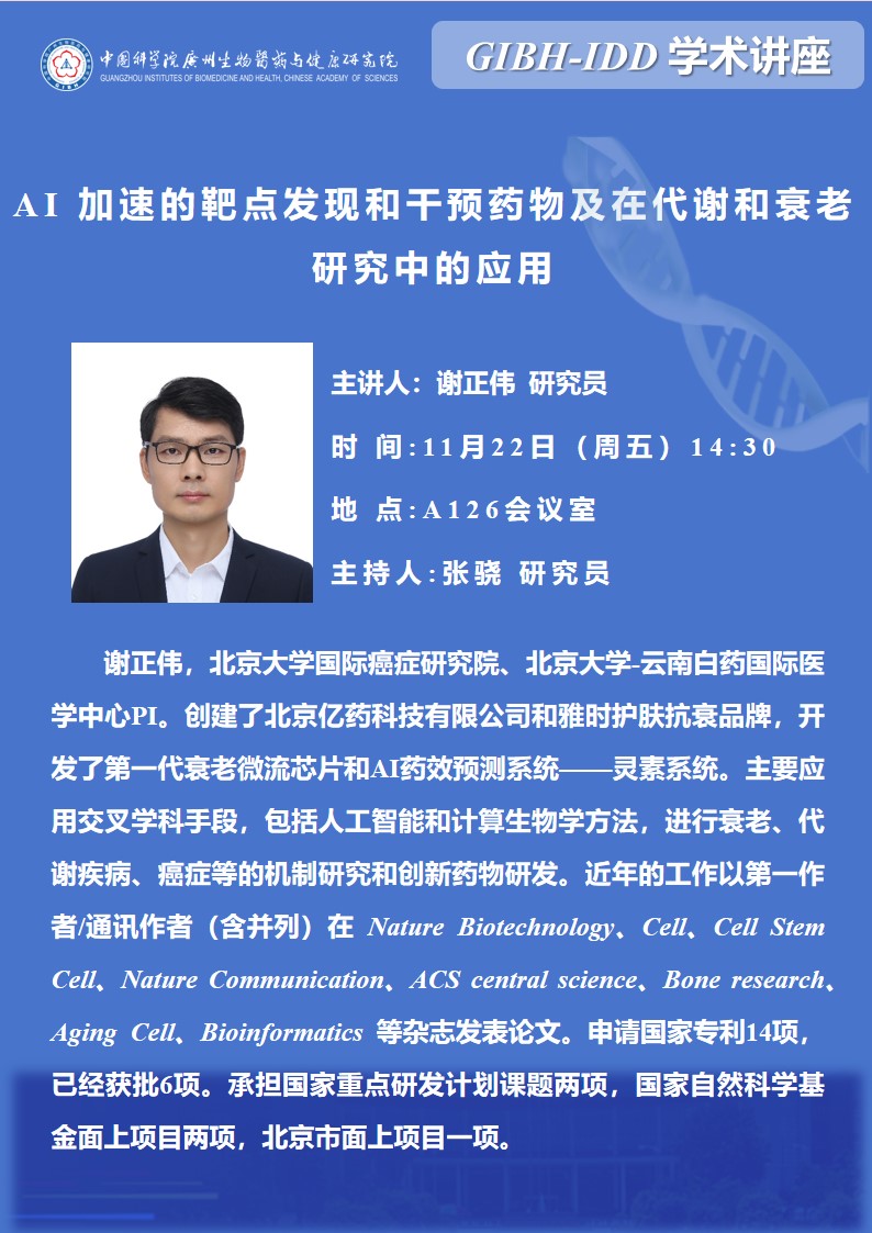 2024年11月22日GIBH-IDD學(xué)術(shù)講座:AI 加速的靶點發(fā)現(xiàn)和干預(yù)藥物及在代謝和衰老研究中的應(yīng)用