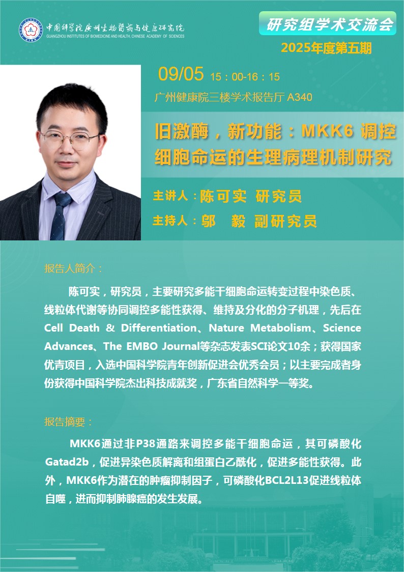2025年5月9日研究組學(xué)術(shù)交流會(2025年度第五期):舊激酶,新功能:MKK6 調(diào)控細(xì)胞命運(yùn)的生理病理機(jī)制研究