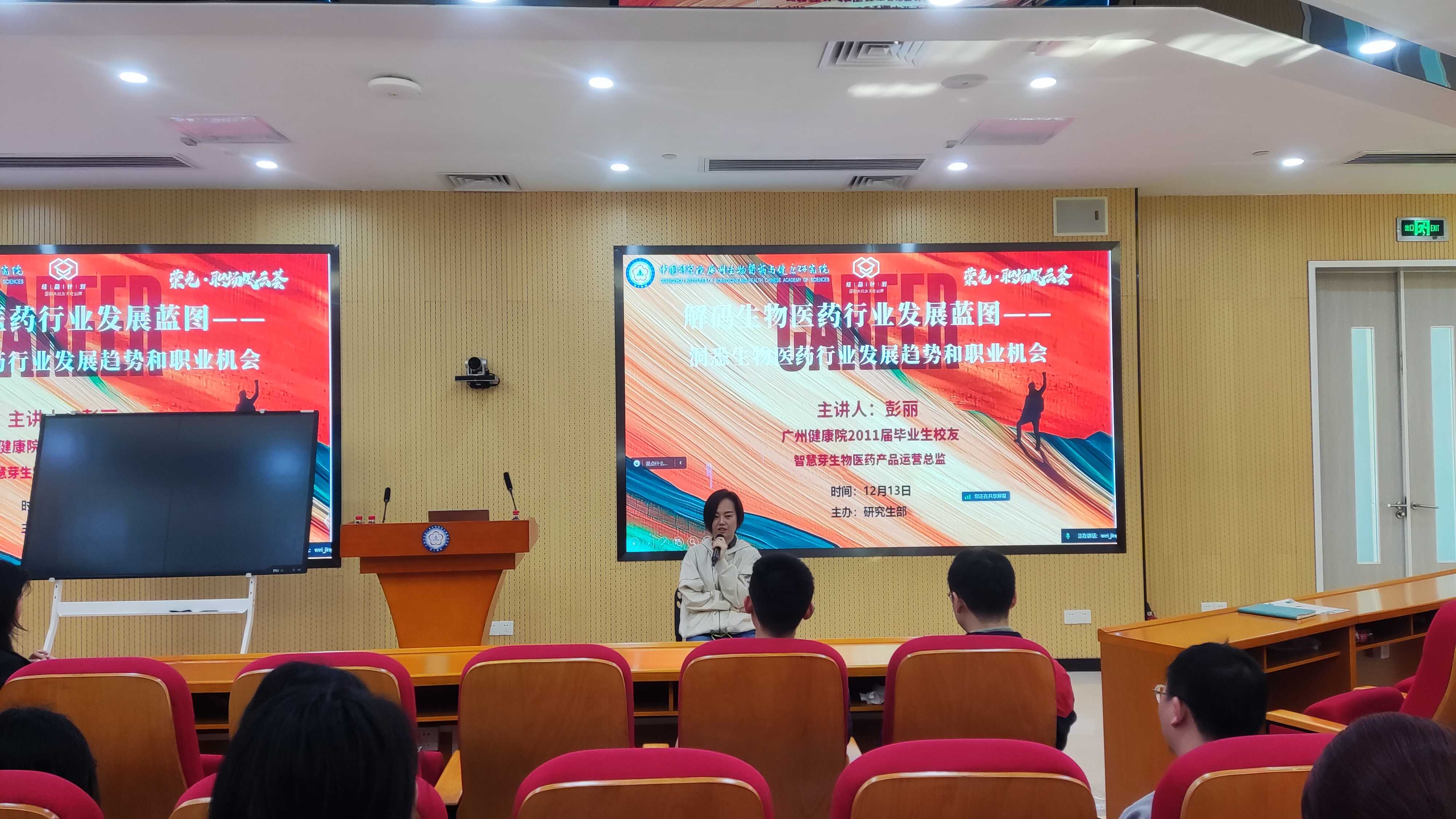 為助力研究生職業(yè)規(guī)劃,幫助研究生了解生物醫(yī)藥行業(yè)未來職業(yè)趨勢和職業(yè)機(jī)會,12月13日,廣州健康院舉辦“解碼生物醫(yī)藥行業(yè)發(fā)展藍(lán)圖——洞悉生物醫(yī)藥行業(yè)發(fā)展趨勢和職業(yè)機(jī)會”專題交流會,邀請2011屆畢業(yè)生校友彭麗來院與在學(xué)研究生座談交流。